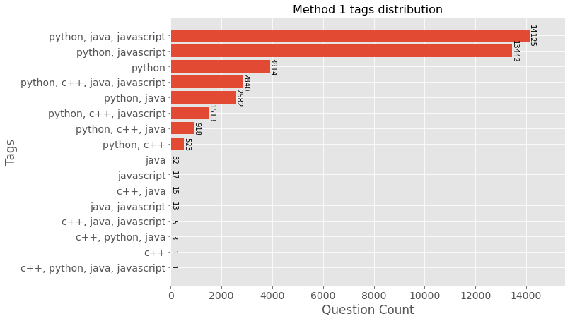 Les questions ont alors été filtrées pour ne conserver que celles associées aux 50 tags les plus utilisés sur cette période, en supprimant également celles possédant plus de 5 tags.