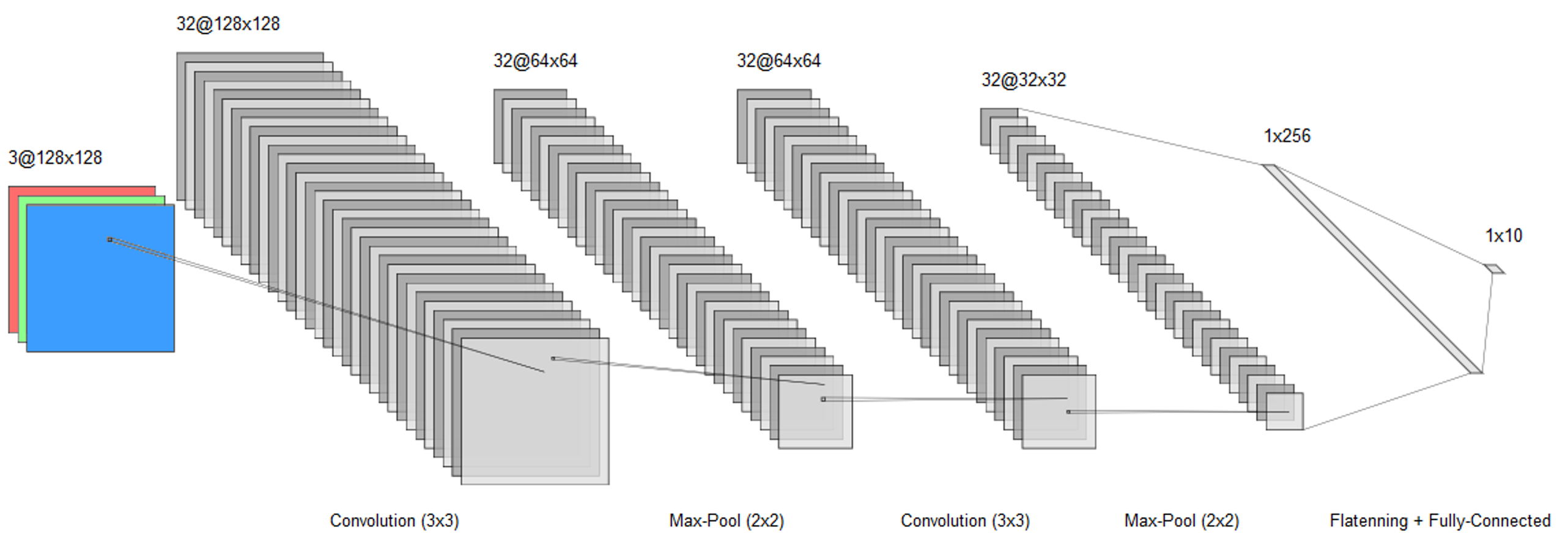 - Deux blocs Convolution(3*3) + Pooling(2*2)